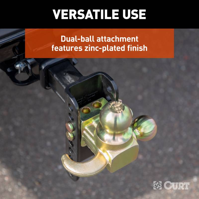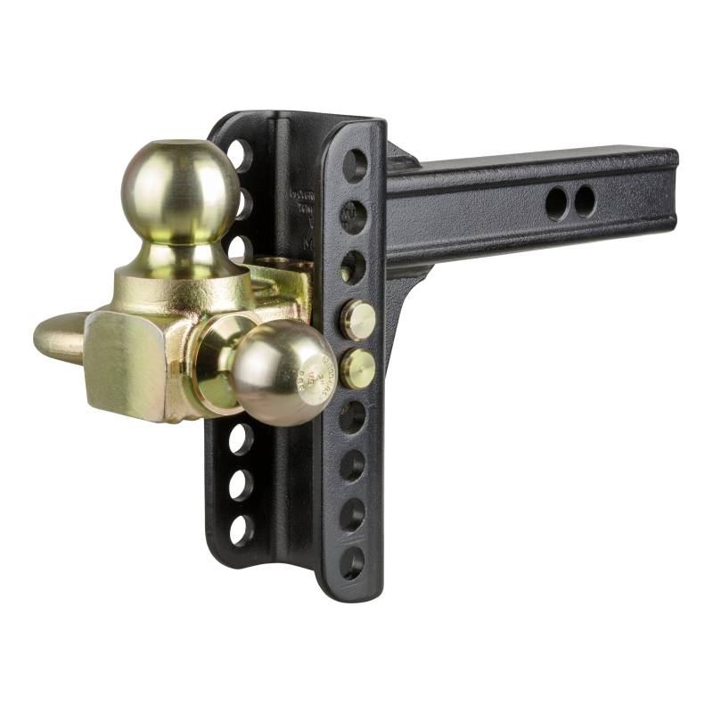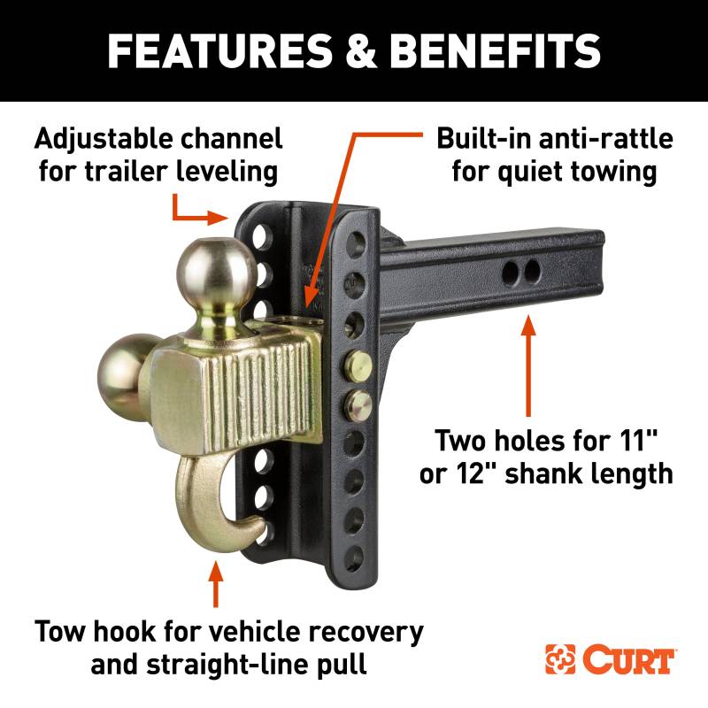 If you own multiple trailers or frequently tow a variety of loads, you know how much time and money are spent tailoring your towing system to each and every individual trailer. There is nothing more inconvenient than switching back and forth between a few different ball mounts and trying to remember which mount fits with which trailer. A CURT adjustable ball mount is your multipurpose towing solution. This CURT adjustable channel-style ball mount has a shank size of 2" x 2" and features a multipurpose head with two different trailer ball sizes to accommodate two different coupler sizes: 2" and 2-5/16". It also features a hitch step for easier truck bed access, as well as a tow hook for straight-line pull applications (max tow hook capacity is 10,000 lbs.; DO NOT EXCEED TRAILER HITCH CAPACITY). The head attaches to an adjustable shank assembly with multiple mounting holes for varying ball heights. Each trailer ball can be raised to a maximum of 5-1/4" rise or lowered to a maximum of 6" drop, allowing you to make your trailer completely level in any towing situation. The channel-style design and dual-pin mounting system also provide a built-in anti-rattle feature to eliminate obnoxious chucking noises. This CURT adjustable ball mount offers a gross trailer weight capacity of up to 10,000 lbs. for the 2" ball and 14,000 lbs. for the 2-5/16" ball. It allows you to tow a variety of heavyweight trailers, and it features two pin holes in the shank to be mounted at an 11" or 12" length. All CURT channel-style adjustable ball mounts are made with sturdy steel construction and come with our black carbide powder coat finish for long-lasting rust, scratch and UV resistance.