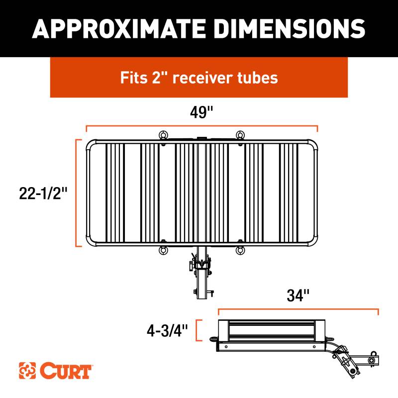 The CURT ActiveLink cargo carrier is built around a revolutionary coupling technology that allows the accessory to be installed on your vehicle faster and easier than ever. Plus, this aluminum cargo carrier provides generous storage space for your items, a 500-pound weight capacity, and it weighs only 25 pounds. The secret to this cargo carrier is its ActiveLink shank. Once the shank is installed in the receiver hitch on your vehicle, the cargo carrier can be mounted in seconds with very little effort. No more climbing down on your hands and knees to line up rusty, grimy components. The shank has an integrated rest point to line the cargo carrier up perfectly, and it features a plastic lining for reduced vibrations. Pop on the carrier when you need it and easily pop it off when you don't. The ActiveLink shank is also compatible with other ActiveLink accessories, allowing you to swap out your cargo carrier with a bike rack, ball mount or whatever the day's adventure demands. This aluminum hitch cargo carrier from CURT provides dependable strength, featuring a 500-pound rating. It assembles with only four bolts, and it weighs only 25 pounds, making it even easier to install, remove, lift and hang for storage. The aluminum structure is covered in a durable carbide black powder coat finish, giving it long-lasting resilience to the outdoor elements.