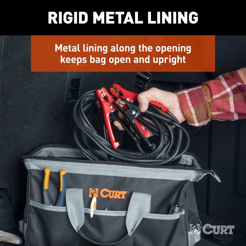 This CURT tool bag is the perfect way to store your towing accessories in your vehicle. Rather than throwing them haphazardly in the trunk or truck bed, this storage bag allows you to keep all of your equipment organized and on-hand, ready to use. It's the ideal towing accessory bag, providing reliable storage for a ball mount, trailer ball, hitch lock, adapters, cables and more. It is also perfect for storing flat towing equipment, such as a tow bar, attachment tabs and locks. The CURT towing accessories bag is constructed from tough fabric and reinforced with straps to hold heavy tools. It comes with 14 pockets for great organization and features a metal lining to keep the opening propped open while you work. For ergonomic portability, this storage bag also features comfort-grip handles.