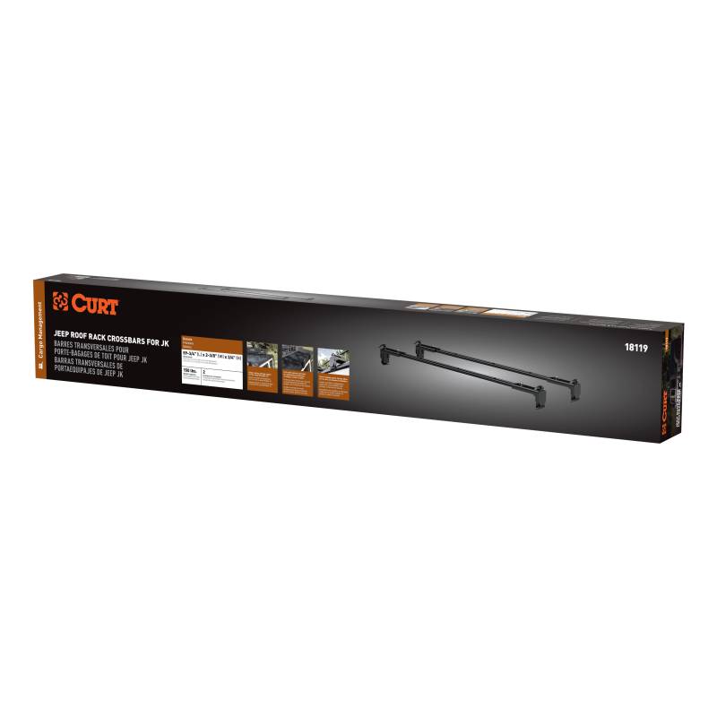 CURT Jeep roof rack crossbars make your Jeep Wrangler JK ready for any adventure. They quickly clamp onto the roof and create an entirely new storage space for a wide variety of cargo. The unique feature of these cargo brackets is their quick-release clamps. The ends of each bracket are equipped with a gutter clamp that securely mounts onto the roof gutters whenever needed. The brackets can then be loaded with a cargo carrier, basket, kayak racks or other items. The clamps are constructed from powder-coated steel for maximum strength, and they help keep your cargo fully secure no matter where the trail takes you. When the adventure ends, the brackets can easily be removed by simply pulling clamp latches. CURT Jeep roof rack crossbars also have a fully slotted channel. The slots can accept bolts or hardware from a roof rack cargo carrier or any number of straps, ropes or bungees. With multiple slots spanning the length of the bracket, straps can also easily be adjusted. CURT Jeep roof rack crossbars are rated for a maximum capacity of 150 lbs. They come with all necessary hardware and require no drilling or vehicle modification for installation. They are designed to fit the Jeep Wrangler JK (compatible with hardtop only). Two brackets are included per package.