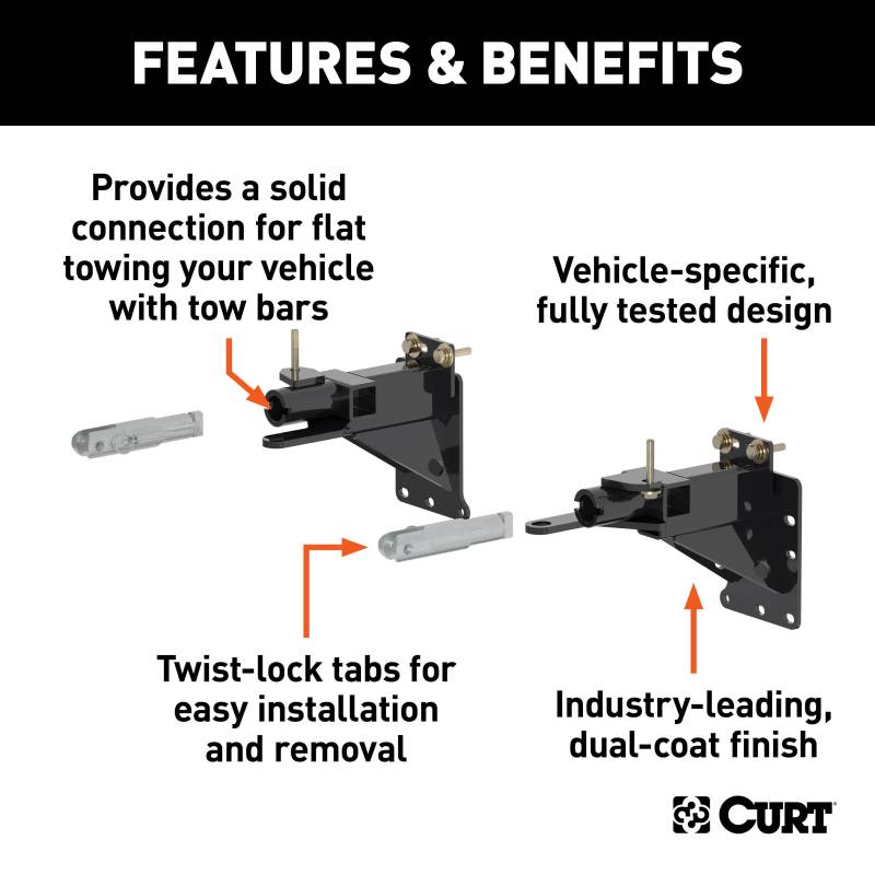 CURT tow bar base plates are engineered for a custom fit on each unique vehicle. This custom tow bar base plate fits select years of the Jeep Cherokee (see application info to verify fitment). It features an OE style design to fully integrate with the front of the vehicle and maintain a factory look. This Jeep Cherokee tow bar baseplate is constructed from high-quality steel and is precisely welded for a perfect fit. It is physically tested for absolute safety and peace of mind while dinghy towing. It also features a unique co-cured finish of liquid A-coat and highly durable powder coat to protect against the outdoor elements. This base plate for towing comes with attachment tabs, safety cables and installation hardware.