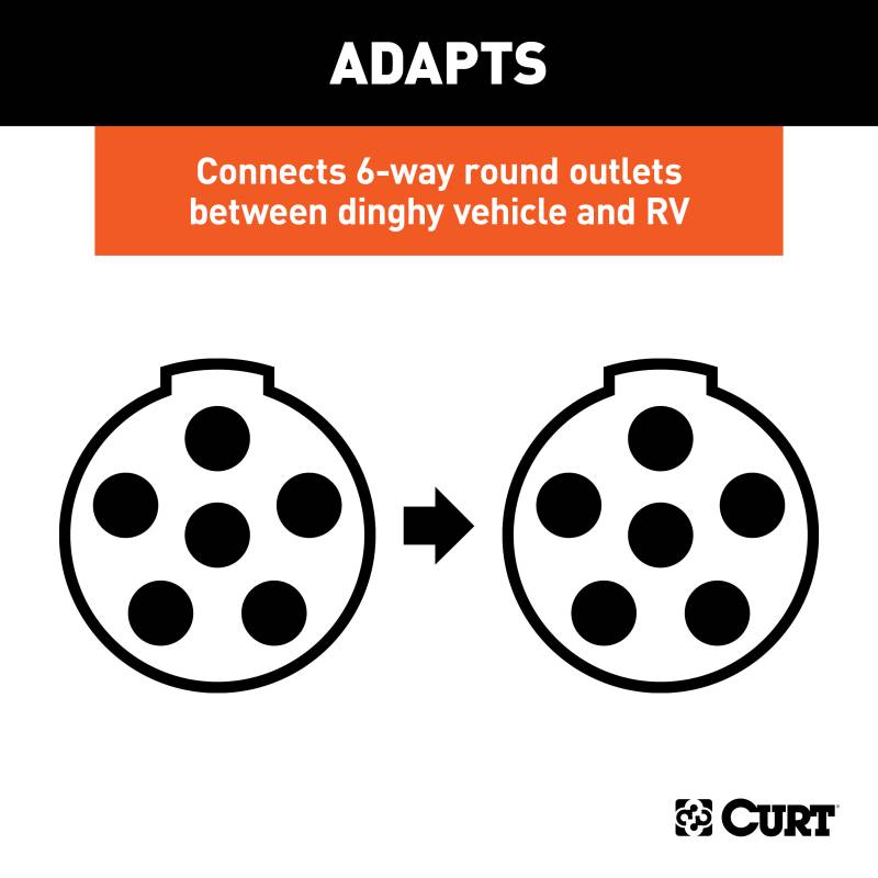 There are several different types of connectors used to supply power from a tow vehicle's electrical system to a trailer's wiring system. Some trailers only need the bare essentials -- running lights, brake lights and turn signals -- while others require a connection for reverse lights, electric brakes and auxiliary power. With connectors ranging from simple to complex, it may be the case that the connection between your vehicle and your trailer is not a perfect match. For example, your truck may be equipped with a 6-way round socket, but your trailer may have a 4-way flat plug. For this very common problem, CURT offers a quick and simple solution in the form of an electrical adapter. An adapter is an electrical device that allows a connection to be made between a mismatched trailer plug and vehicle socket. It easily plugs in your vehicle's electrical socket and usually requires no additional wiring. CURT offers an array of adapters to accommodate most types of plugs and sockets, including 4-way flat, 4-way round, 5-way flat, 6-way round, 7-way RV blades and more. This electrical adapter is designed to create a 6-way round wiring connection between a dinghy-towed vehicle and an RV. It is particularly intended for use in flat towing and dinghy towing to connect the dinghy vehicle to the motorhome. It comes with two 6-way round sockets that can be spliced into the flat-towed vehicle at the front and into the back of the RV. All CURT wiring and electrical products come with a one-year limited warranty to give you the assurance you need to tow with confidence.