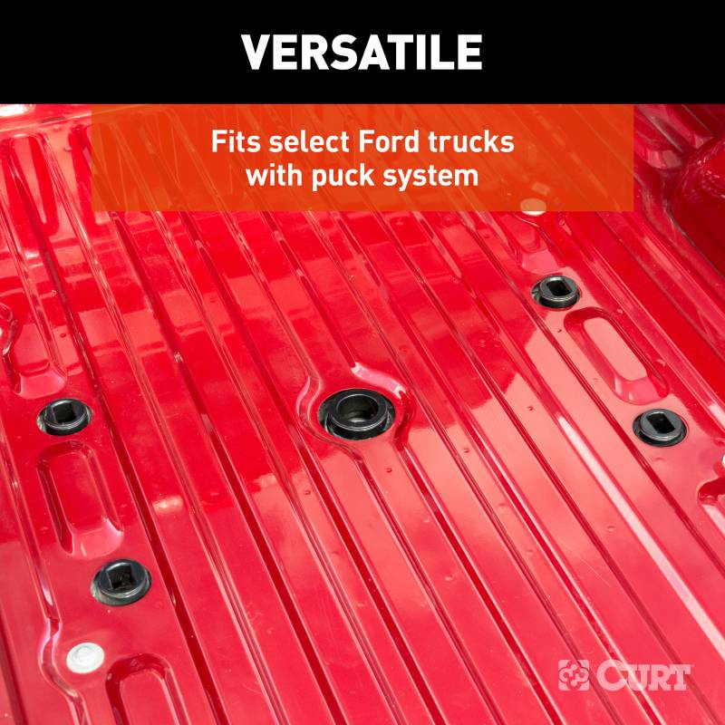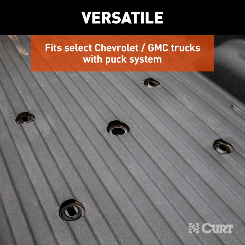 The CURT OEM puck system 5th wheel adapter for Chevy, Ford and GMC pickups combines the functionality of CURT 5th wheel puck system products with the strength and convenience of the truck bed puck system. The adapter provides a set of industry-standard 5th wheel rails to securely mount a CURT 5th wheel hitch or roller into the bed of your truck. It is designed to fit select model years of the Chevrolet Silverado, GMC Sierra 2500 HD and 3500 HD and Ford F-250 and F-350 Super Duty (see application info to verify fitment). It features a set of adjustable, quarter-turn anchors to quickly and easily drop into the pucks and provide a moveable platform for the 5th wheel coupling point. This puck system adapter requires a specific puck system for installation (year range specific). It features a capacity of 25,000 lbs. and is compatible with all CURT 5th wheel legs and rollers (weight capacities are limited to the lowest-rated towing component). Like our other OEM puck system 5th wheel products, the key feature of the 5th wheel puck system adapter is its quarter-turn anchors. With the hitch initially bolted onto the adapter, the adapter can easily be dropped into place whenever needed and secured with the quarter-turn anchors. The anchors can also be adjusted to help eliminate chucking noises between the adapter and under-bed platform while towing. When you are finished towing, simply turn the anchors to remove the entire assembly within seconds. The CURT 5th wheel adapter for select Chevrolet, Ford and GMC pickup trucks provides the ultimate in versatility for the CURT 5th wheel line. It tested for safety in accordance with SAE J2638 and is coated in a highly durable carbide black powder coat finish to protect against scratches and rust.