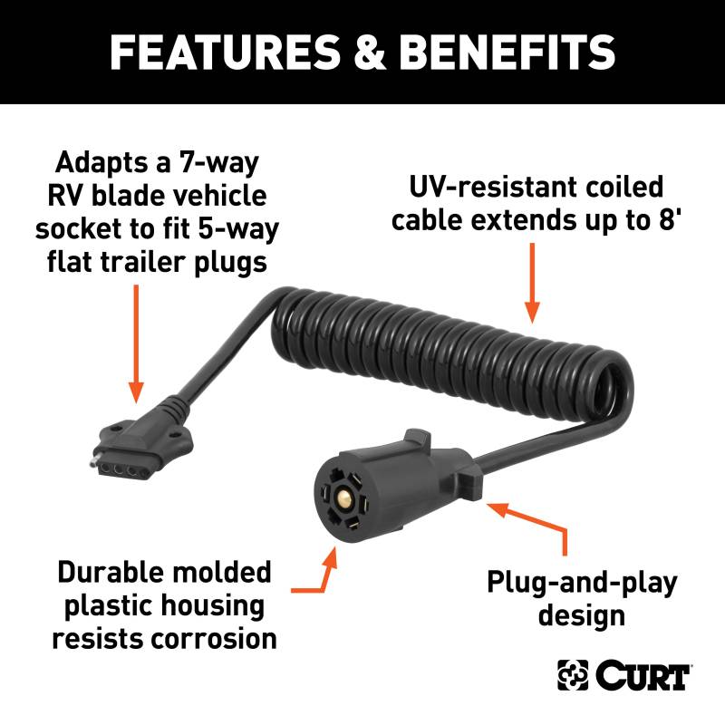 There are several different types of connectors used to supply power from a tow vehicle's electrical system to a trailer's wiring system. Some trailers only need the bare essentials -- running lights, brake lights and turn signals -- while others require a connection for reverse lights, electric brakes and auxiliary power. With connectors ranging from simple to complex, it may be the case that the connection between your vehicle and your trailer is not a perfect match. For example, your truck may be equipped with a 6-way round socket, but your trailer may have a 4-way flat plug. For this very common problem, CURT offers a quick and simple solution in the form of an electrical adapter. An adapter is an electrical device that allows a connection to be made between a mismatched trailer plug and vehicle socket. It easily plugs in your vehicle's electrical socket and usually requires no additional wiring. CURT offers an array of adapters to accommodate most types of plugs and sockets, including 4-way flat, 4-way round, 5-way flat, 6-way round, 7-way RV blades and more. This electrical adapter is designed to adapt a 7-way RV blade vehicle socket to fit a 5-way flat trailer plug. It is constructed from quality plastic and requires no splicing. All CURT wiring and electrical products come with a one-year limited warranty to give you the assurance you need to tow with confidence.