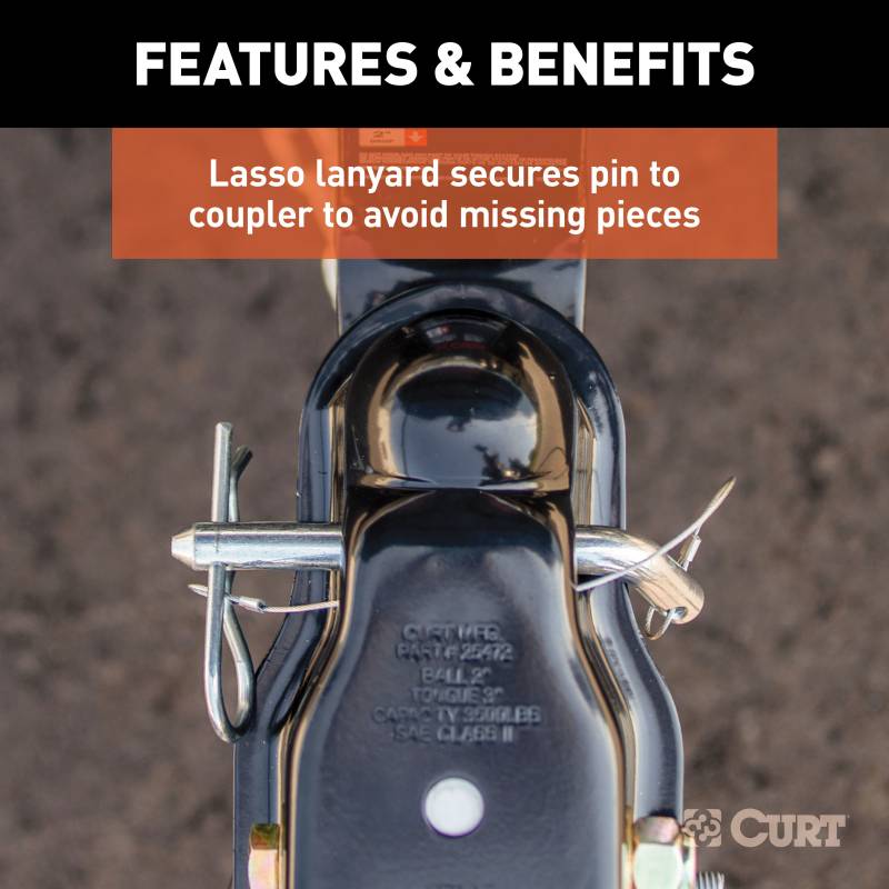 The CURT QuickPin trailer coupler is a revolutionary coupler design, doing away with the traditional latch mechanism for simple, stress-free trailer hookup. Most couplers use a complicated hinging latch that's prone to wear out and become corroded, leading to difficulties and frustration. Instead of a latch, QuickPin uses a simple hitch pin to create a safe, reliable, hassle-free towing connection. It's as easy as dropping the trailer tongue onto the hitch ball, inserting the QuickPin hitch pin, and that's it! No more wrestling with a rusty latch, and no adjustment or tightening needed. This trailer hitch coupler is fully tested according to SAE J684 specifications. It is rated for 3,500 pounds and fits any standard 2-inch diameter trailer ball. The coupler channel can be mounted on a 3-inch wide trailer tongue beam, featuring standard mounting holes to fit most existing bolt patterns (mounting hardware not included). It is also finished in a durable black powder coating for lasting rust resistance. NOTE: This coupler comes with a 1/2-inch pin that must be used when connecting the trailer. It may not be replaced with a different 1/2-inch pin.