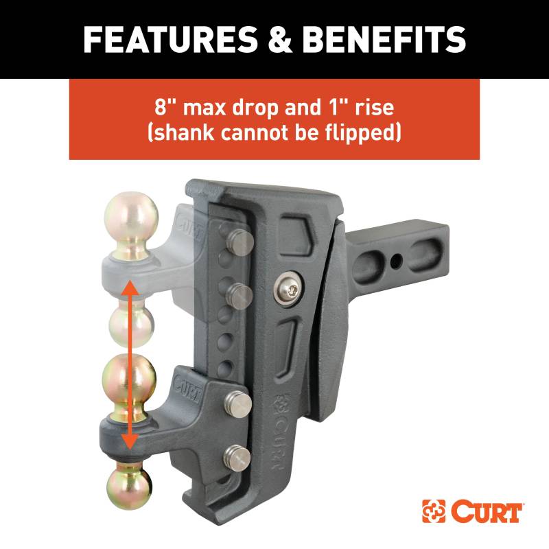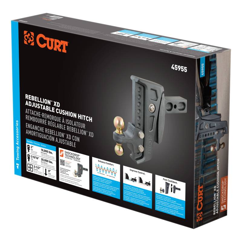 The CURT Rebellion XD adjustable cushion hitch ball mount upgrades your towing system with a smoother ride, greater control and enhanced longevity, all while providing exceptional towing power with virtually no need for maintenance. It is unlike any other ball mount because it operates using ShockDrop technology. At the core of this heavy-duty ball hitch is a cushion isolator that resists jerking, jarring, bumps, vibrations, chucking and rattling noise at the coupling point. Unlike a cushion hitch or torsion hitch that uses airbags or bearings, ShockDrop offers extended resistance to wear without the need for maintenance. The result is a more comfortable drive, increased driver control and better management of the vehicle-trailer combination in events of sudden braking. The adaptive, suspension mechanism and lightweight design of this cushion hitch help minimize stress on your vehicle and its suspension and braking systems. The Rebellion XD shock-absorbing hitch is also an adjustable trailer hitch ball mount, featuring a highly versatile vertical shank that promotes level towing, even with large, lifted trucks. The vertical shank has 8 height adjustment positions with a maximum drop of 8 inches and rise of 1 inch (shank cannot be flipped to rise position). For dependable towing strength, the Rebellion XD cushion hitch ball mount is tested and rated for 10,000 pounds for the 2-inch ball and 20,000 pounds for the 2-5/16-inch ball (limited to lowest-rated towing component). It has a standard 2-1/2-inch x 2-1/2-inch shank. For long-lasting weather resistance, the Rebellion XD is protected with a textured, dark grey teridium finish to withstand rain, dirt, UV damage and other corrosive threats.