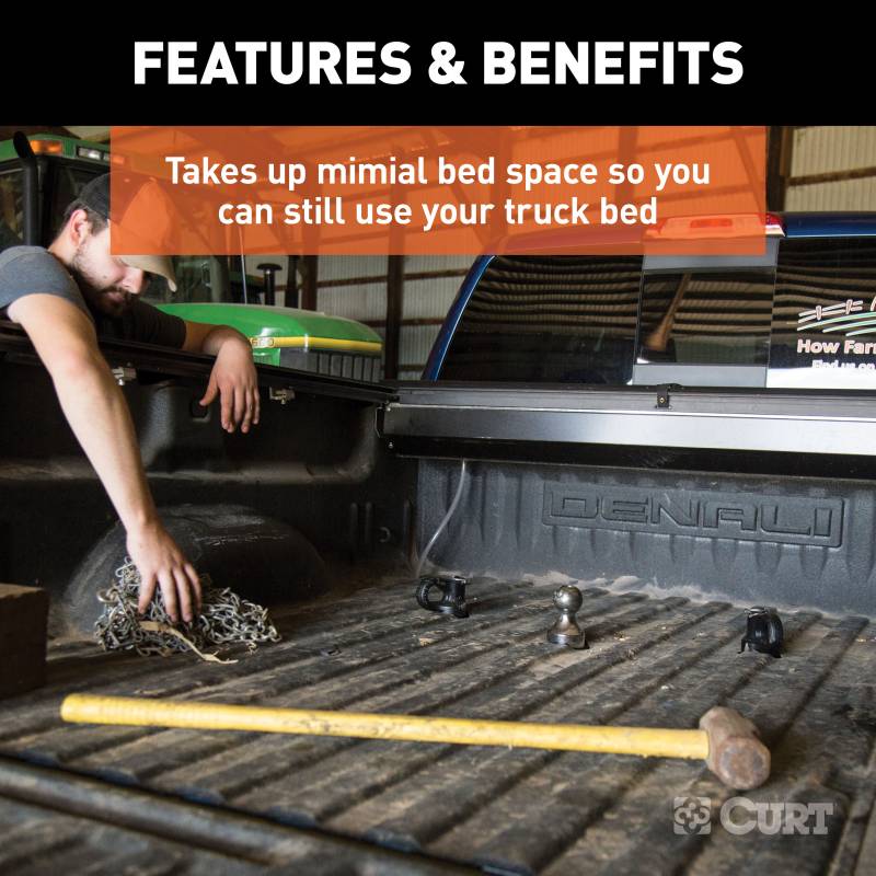 Outfitting your pickup to tow gooseneck trailers is easy with the CURT OEM puck system gooseneck ball and safety chain anchor kit. The components of this 38K kit easily drop into the truck bed pucks, instantly equipping the truck for gooseneck towing. The kit includes a gooseneck ball, safety chain anchors, a rubber hole cover and a durable storage case. It is designed specifically for the Chevrolet, Ford, GMC or Nissan Titan XD puck system and cannot be installed without it. It is rated for 38,000 lbs. GTW and 9,500 lbs. vertical load. The OEM puck system gooseneck ball perfectly fits into the center ball hole and provides a 2-5/16" ball to fit most standard gooseneck trailers. It features with a patented installation system, operating with a simple quarter-turn latch lock for ease of use and a secure mount. Retention balls, built into the shank, keep the gooseneck ball fixed into the receiver hole and keep your trailer locked on tight. Also included in the kit are CURT OEM puck system gooseneck safety chain anchors. Like the gooseneck ball, these patented anchors are made specifically for Chevrolet, Ford, GMC or Nissan Titan XD pickup trucks with the puck system and provide a reliable connection for your gooseneck trailer. They feature a simple drop-in installation system with no tools required, and they offer large safety chain loops to accept heavy-duty clevis hooks. These safety chain anchors are constructed from heavy-duty, cast steel and have a highly durable powder coat finish. Finally, this gooseneck puck system kit includes a tough rubber hole cover to keep water, dirt, grime and rust out of the gooseneck ball hole. The cover installs with a friction fit and helps extend the life of your gooseneck hitch. We also include a durable plastic storage case with each kit to keep the components protected and together for easy storage. The case can be stored inside your truck or truck bed tool box to keep the ball and anchors on-hand whenever you need them.