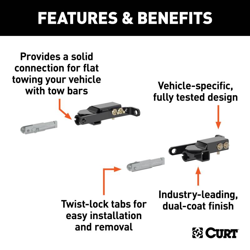 CURT tow bar base plates are engineered for a custom fit on each unique vehicle. This custom tow bar base plate fits select years of the Cadillac Escalade, Chevrolet Suburban, Chevrolet Tahoe, GMC Yukon and GMC Yukon XL (see application info to verify fitment). It features an OE style design to fully integrate with the front of the vehicle and maintain a factory look. This Cadillac / Chevrolet / GMC tow bar baseplate is constructed from high-quality steel and is precisely welded for a perfect fit. It is physically tested for absolute safety and peace of mind while dinghy towing. It also features a unique co-cured finish of liquid A-coat and highly durable powder coat to protect against the outdoor elements. This base plate for towing comes with attachment tabs, safety cables and installation hardware.