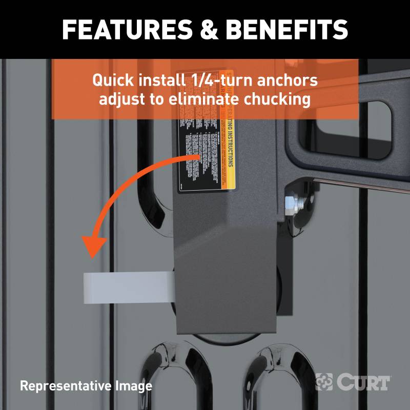 The CURT A20 5th wheel hitch offers smoother, quieter towing for your home-away-from-home, combining the patented technology of our A-series, an easier mounting system and the power of a 20K 5th wheel hitch. Like our A16 hitch, this 20K 5th wheel hitch uses a patented cast yoke to allow for unimpeded head movement, while providing exceptional stability for the trailer. The yoke has a set of poly-torsion inserts to suppress shock loads and reduce excessive noise, and the head features high-strength, interlocking jaws to give the trailer stability and the freedom to pivot and swivel as needed. This A20 5th wheel hitch also comes with a set of CURT OEM puck system 5th wheel legs designed to be mounted on select Chevrolet or GMC trucks with the truck bed puck system (year range specific). The legs mount directly into the four-point mounting system, allowing the CURT A20 hitch to be installed quickly and easily. The most unique feature of these legs is their quarter-turn anchoring system. The variable-position anchors allow the 5th wheel hitch head to easily drop into the puck system, and with a quarter-turn, the hitch can be installed or removed as needed. The anchors can also be adjusted to eliminate any chucking noises. Once installed, the A20 is fast and simple to operate. It has a lockable, single-throw handle that self-resets to the ready-to-couple position after uncoupling, and it is equipped with a coupling indicator that is visible from the truck cab. To protect the A20 5th wheel hitch against rust and wear, it comes with a black carbide powder coat finish and a limited lifetime warranty. We also test the A20 for safety in accordance with SAE J2638 to ensure reliability for the road ahead.