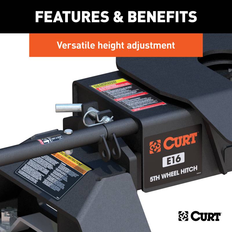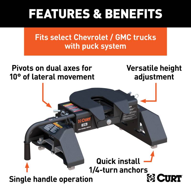 The CURT E16 5th wheel trailer hitch is an economical choice that offers a variety of features for smooth, safe 5th wheel towing. The E16 has a gross trailer weight rating of 16,000 lbs. and can withstand a vertical load up to 4,000 lbs. It comes with a dual-pivoting head, 10 degrees of lateral movement and an anti-rattle skid plate to provide a smoother, quieter ride. The E16 also comes with easy, single-handle operation and a durable carbide black powder coat for long-lasting protection against the elements. With four height adjustment settings, the E16 is quick and simple to install, and it is backed by a limited lifetime warranty. This 16K 5th wheel hitch comes with a set of CURT OEM puck system 5th wheel legs, designed to be mounted on select Chevrolet or GMC long-bed pickup trucks with the truck bed puck system (year range specific). Using a set of quarter-turn anchors, the legs quickly and easily drop into the pucks, instantly mounting the E16 hitch and equipping the truck for 5th wheel towing. The anchors feature an adjustable design to perfectly lock the hitch into place and eliminate any chucking noises, and the legs are finished in a durable carbide black powder coat to be highly resistant to scratches, rust and UV damage. These legs are intended to fit select Chevrolet and GMC pickup trucks with the puck system and cannot be installed without it.