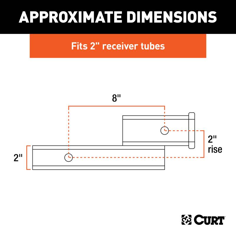 CURT hitch adapters and extenders are easy to use and help provide level towing for your trailer. This receiver hitch adapter is designed to fit a 2-inch x 2-inch receiver tube opening. It not only extends the receiver but also provides 2 inches of drop or 2 inches of rise. It is great for adjusting the height of a ball mount, bike rack or other hitch accessories. It has a max weight capacity of 7,500 lbs. This raised hitch adapter extension is also ideal for dinghy towing, allowing you to level your tow bar with the vehicle base plates. CURT hitch adapters are crafted to be durable and dependable. This drop down hitch adapter features a strong steel construction, precise welding and a durable black powder coat finish for lasting resistance against rust, chipping and UV damage.