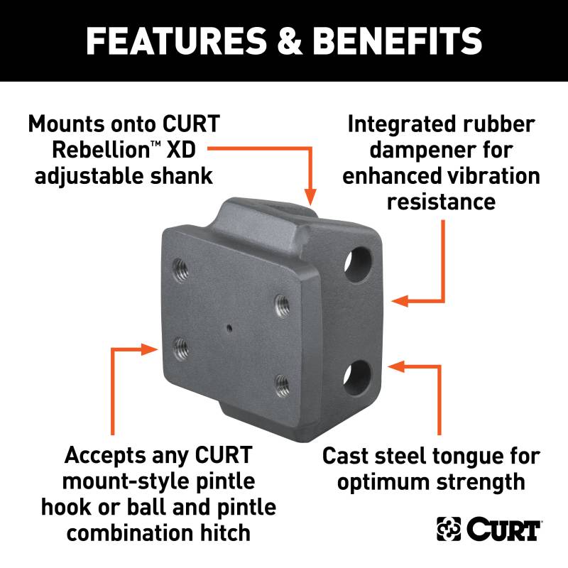 This accessory for the Rebellion XD ball mount features standard pintle hole spacing to accept any CURT plate-mount pintle hitch. The holes are spaced 3-5/16-inch wide by 1-3/4-inch high. This pintle mount attachment also features an integrated rubber dampener to compliment the Rebellion XD ball mount's resistance to jerking, jarring, vibrations and noise. The CURT Rebellion XD adjustable cushion hitch ball mount upgrades your towing system with a smoother ride, greater control and enhanced longevity, all while providing exceptional towing power with virtually no need for maintenance. It is unlike any other ball mount because it operates using ShockDrop technology. At the core of this heavy-duty ball hitch is a cushion isolator that resists jerking, jarring, bumps, vibrations, chucking and rattling noise at the coupling point. Unlike a cushion hitch or torsion hitch that uses airbags or bearings, ShockDrop offers extended resistance to wear without the need for maintenance. The result is a more comfortable drive, increased driver control and better management of the vehicle-trailer combination in events of sudden braking. The adaptive, suspension mechanism and lightweight design of this cushion hitch help minimize stress on your vehicle and its suspension and braking systems.