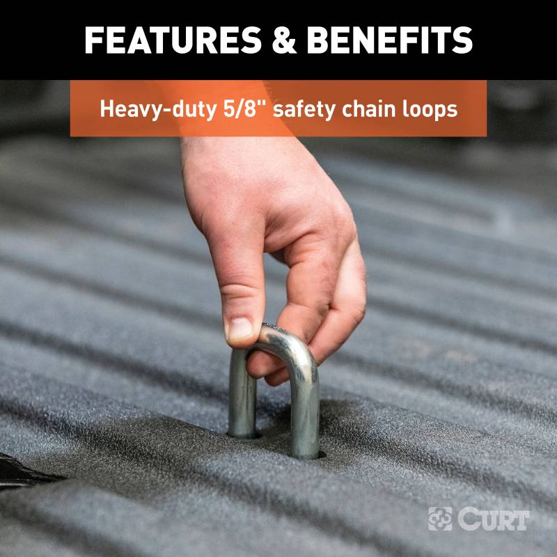 Ingenious design and reliability -- these words don't just describe the Chevrolet Silverado and GMC Sierra 2500 HD and 3500 HD; they were the inspiration for the CURT OEM-style gooseneck hitch for GM. This hitch is built to excel in two key things: ease of installation that comes from an ingenious design and safe, reliable towing even with heavy-duty gooseneck trailers. The Chevy / GMC-compatible gooseneck hitch boasts a one-person installation. It is built with fewer pieces than competitor hitches to keep installation simple, and the pieces are designed to be compact so they can be lifted and bolted into place without the help of a second person. We've also eliminated a number of steps from the process to speed up installation time and reduce the number of modifications needed on the vehicle. The hitch does not require the exhaust or spare tire to be lowered. It requires no welding, temporary truck bed removal or even bed flange trimming. Best of all, pre-existing factory holes are used to mount the hitch to the truck's frame, meaning the only drilling necessary is for the gooseneck ball hole and safety chains in the truck bed. Once installed, the OEM-style gooseneck hitch for Chevrolet / GMC offers simple operation and highly secure towing. It is tested in accordance with SAE J2638 to safely tow up to 38,000 lbs. GTW. Instead of a side handle mounted under the wheel well, it uses a latch-locking trailer ball. This patented 2-5/16" ball easily drops into the gooseneck head from above the truck bed and is secured in place with a simple quarter-turn of the latch. This Chevrolet Silverado / GMC Sierra 2500 HD and 3500 HD gooseneck hitch also features heavy-duty 5/8" safety chain anchors for dependable security for your trailer, whether you're towing livestock, machinery or construction materials. To ensure maximum quality, the CURT OEM-style gooseneck hitch for GMC and Chevrolet comes with a tough A-coat finish to easily resist rust and scratches.