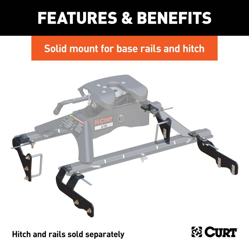 When you purchase a 5th wheel trailer hitch, you expect it to be capable of towing your RV, flatbed or whatever other 5th wheel trailer you own. While a 5th wheel hitch does offer an impressive amount of towing strength, it cannot get far without the proper installation equipment. Engineered for specific makes and models, CURT custom 5th wheel brackets provide the ideal solution for complementing the power of your 5th wheel trailer hitch. A custom 5th wheel bracket features a shape that contours to the frame of your truck and uses pre-drilled holes in the frame wherever possible to make installation quick and easy. Depending on your model of pickup truck, they also reduce or eliminate the need for drilling. These particular custom 5th wheel brackets offer a custom fit for certain model years of the Ram 1500 (see application info to verify fitment). Finished in a durable liquid A-coat, CURT custom 5th wheel brackets are made to last. They include all necessary mounting hardware and are designed to be used in conjunction with CURT industry-standard 5th wheel base rails #16104 or #16204 (base rails sold separately).