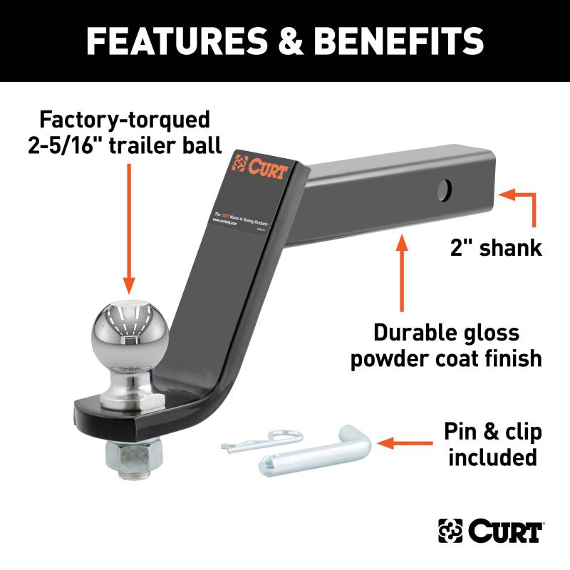When it comes to ball mounts, a CURT loaded ball mount is the complete package. These stingers come with all necessary towing components and are pre-fitted with a factory-torqued trailer ball, eliminating the need to mount and torque your own trailer ball. This means a loaded ball mount is ready for towing right out of the package! Each one also comes with a pin and clip for mounting the ball mount into the appropriate size receiver tube. CURT offers loaded ball mounts in a variety of styles and weight ratings. This CURT loaded ball mount features a gross trailer weight capacity of 7,500 lbs. and a tongue weight capacity of 750 lbs. It comes with a 2-5/16" trailer ball, making it an excellent choice for towing most boat trailers, utility trailers, campers, livestock trailers and recreational vehicle trailers used for hauling dirt bikes, motorcycles and ATVs (NOTE: Never exceed the lowest weight capacity of any towing component; i.e. the vehicle, hitch, trailer, etc). This ball mount also has a length of 9-1/4", a drop of 6" and comes with a gloss black powder coat finish to resist rust, chipping and UV damage. All CURT loaded ball mounts feature 2" x 2" shanks and are made with the same superior quality we put into each of our products.