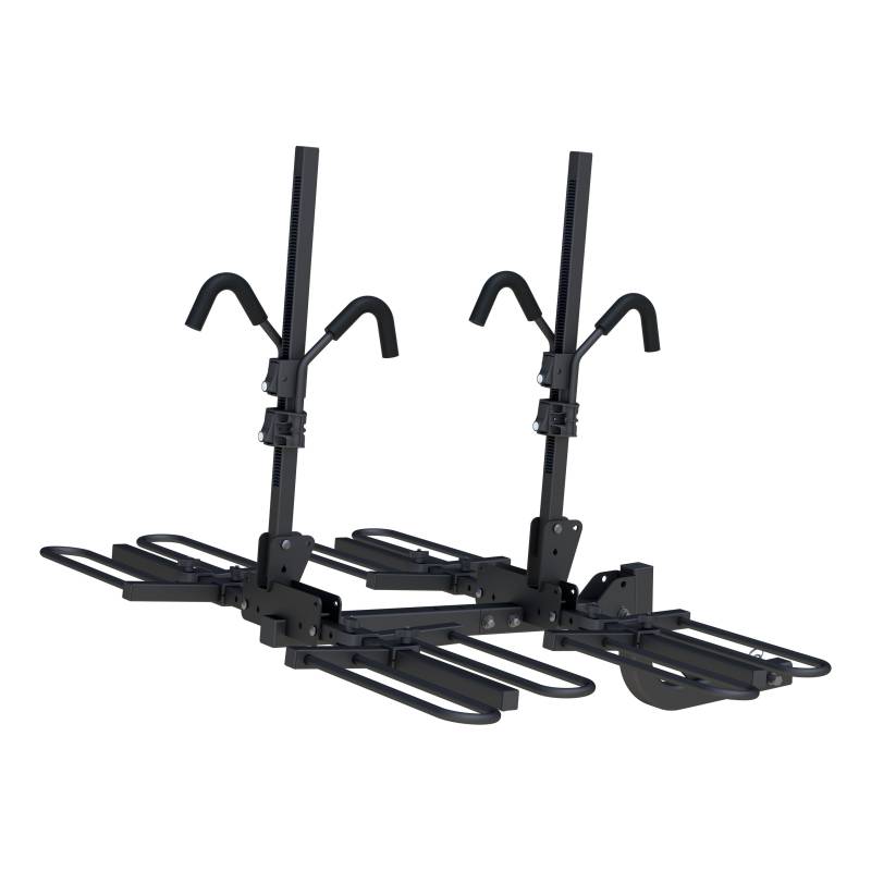 Your bicycle is more than just a frame, tires, handlebars and pedals. You live for what might be around that next turn, that burn in your legs as you climb a rocky trail and that freefall feeling you get as you descend a long hill. Your bike is not just a hobby; it is a gateway to the outdoors and your faithful companion in the wild. It was with this idea in mind that the CURT tray-style bike rack was built. The CURT hitch-mounted tray-style bike rack promotes your biking experience unlike any other because of its unique, three-point support system. It is made to be easier to use and keep bikes more secure, holding them at three points of contact. Instead of hanging the bike by its crossbar, the loop-like tray-style cradles hole the bike's wheels, keeping it secure on each end. The third point is an adjustable, ratcheting arm that moves up and down and locks over the crossbar, keeping the entire bike firmly held in place. Both the tray-style cradles and the vertical ratcheting arm are highly adjustable and can fit virtually any size bike, from a giant adult mountain bike to a single-gear kids' bike. CURT tray-style bike racks are not your average ten-speed. In fact, they are packed with features to truly make it all about the ride. They feature a hitch-mounted design to work with your vehicle's trailer hitch, and they come with a tilt-away feature to allow the entire rack to tilt away from the vehicle. This makes it easy to open a hatchback door or trunk and access the rear cargo area. Tray-style bike racks also feature a foldable, adjustable frame and an anti-wobble shank. This model fits 2" receiver tubes and holds two or four bikes with the extension. NOTE: For use with any frame-mounted 2" class 3 or higher trailer hitch receiver. Clamp-on bumper receivers and traditional 4" square bumpers should not be used to mount bike racks. Do not exceed receiver weight limits.