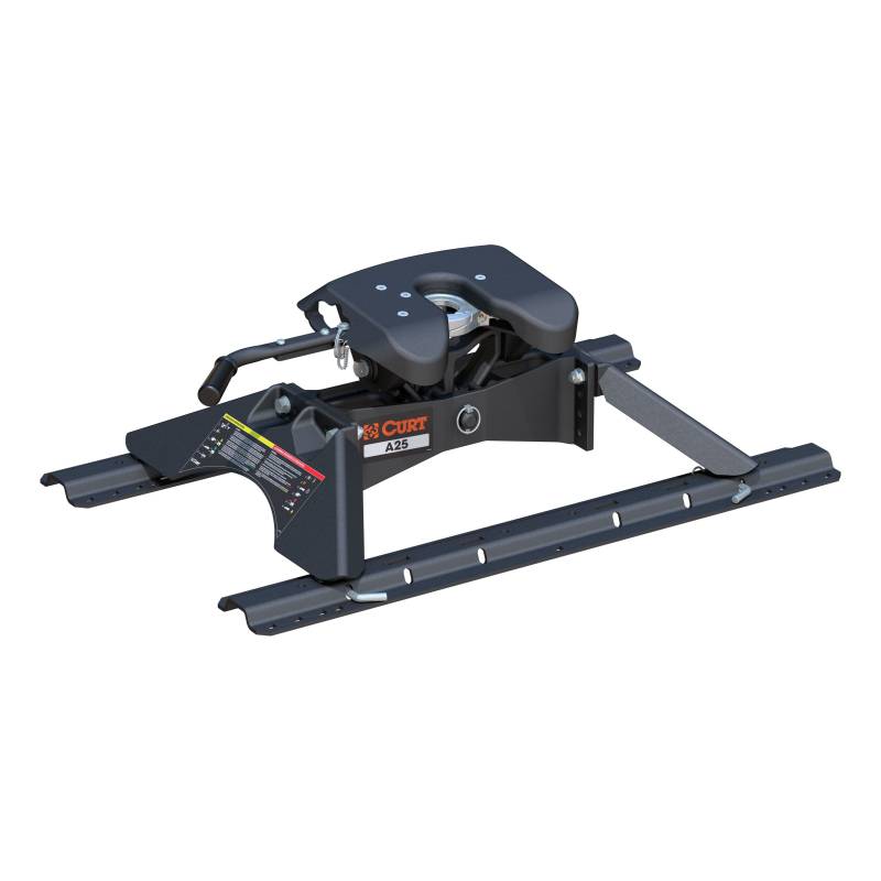 The CURT A25 5th wheel hitch offers smoother, quieter towing for your home-away-from-home, combining the patented technology of our A-series, an easier mounting system and the power of a 25K 5th wheel hitch. Like our A16 and A20 hitches, this 25K 5th wheel hitch uses a patented cast yoke to allow for unimpeded head movement, while providing exceptional stability for the trailer. The yoke has a set of poly-torsion inserts to suppress shock loads and reduce excessive noise, and the head features high-strength, interlocking jaws to give the trailer stability and the freedom to pivot and swivel as needed. The A25 5th wheel hitch is also engineered for easier installation. The legs are equipped with two pins to properly align with the mounting holes, and they have easy-access mounting bolts for ergonomic tightening. The 5th wheel head also has a fast, one-pin removal system to make installation and removal from the truck bed easier. This 25K 5th wheel includes a set of industry-standard 5th wheel base rails to mount onto custom 5th wheel brackets. Once installed, the A25 is fast and simple to operate. It features an extra-wide head opening to increase the coupling area for the trailer, and it has a lockable, single-throw handle that self-resets to the ready-to-couple position after uncoupling. To make coupling even easier, it is equipped with a coupling indicator that is visible from the truck cab. The indicator shows the status of the connection and eliminates the need for you to check multiple times while coupling. To protect the A25 5th wheel hitch against rust, wear and whatever other threats might impede your cross-country tour, it comes with a carbide black powder coat finish and a limited lifetime warranty. We also test the A25 for safety in accordance with SAE J2638 to ensure reliability for the road ahead.