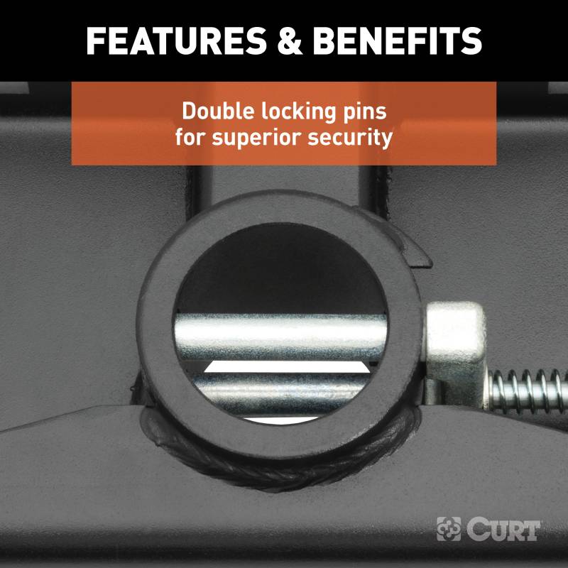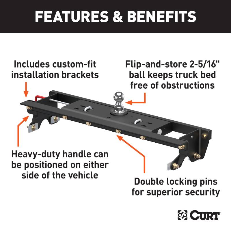 A CURT gooseneck hitch is more than a necessary tool for towing; it is an integrated extension of your truck that allows you turn your 4x4 into the workhorse it was designed to be. That is why CURT offers gooseneck hitch kits that include both the hitch and the installation brackets, making it simpler and easier to get your truck towing-ready. This kit includes the CURT Double Lock gooseneck hitch and installation brackets to match. The under-bed Double Lock gooseneck hitch gets its name from the two locking pins that engage the trailer ball and hold it in place, giving you twice the security when towing especially heavy trailers. The Double Lock mounts underneath your truck bed, using the included brackets, and provides a removable 2-5/16" gooseneck trailer ball with a gross trailer weight capacity up to 30,000 lbs. and a tongue weight capacity of 7,500 lbs. Using the heavy-duty operating handle, the trailer ball can be unlocked and flipped over whenever necessary to allow full use of the truck bed. The Double Lock comes with solid safety chain hookups, an attractive chrome trim ring, a durable A-coat finish and a limited lifetime warranty. This particular Double Lock gooseneck hitch kit is design to be a custom fit for certain years of the Ford F150 (for a complete listing of vehicle and installation bracket compatibility, see application info).
