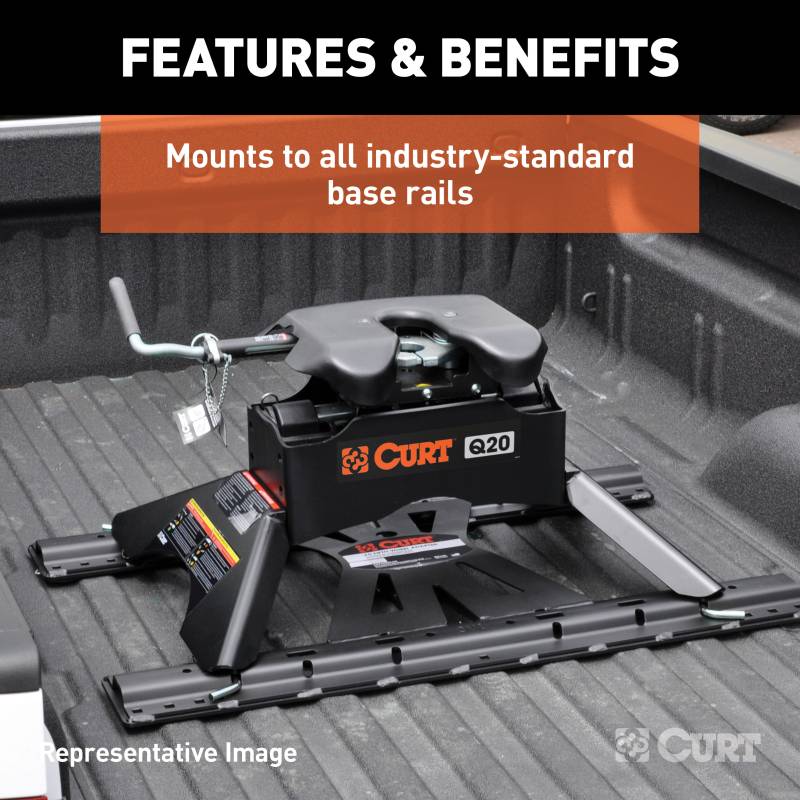 The CURT Q25 5th wheel hitch offers superior towing power and a quiet ride to be the ultimate in RV towing. The Q25 excels in quiet towing operation. Its spherical axial bearing offers free movement of the head, allowing it to tilt in any direction. Once coupled to the kingpin, the head pivots and angles with your 5th wheel trailer. It also uses a pair of dual-locking jaws to completely wrap the kingpin and ensure a secure vehicle-trailer connection. To make the Q25 even quieter, it comes with three grease fittings and a polyethylene lube plate for optimum lubrication. Constructed from strong carbon steel and rigorously tested for safety in accordance with SAE J2638, this 5th wheel hitch offers a gross trailer weight capacity of 25,000 lbs. and a vertical load limit of 6,250 lbs. It is the ideal extension for your full-size 1/2-ton, 3/4-ton or 1-ton pickup truck. To ensure good functionality and a long life under the most strenuous towing conditions, the Q25 is also coated in a black carbide powder coat finish, giving it highly durable protection against rust and wear. Like our other Q-series 5th wheel hitches, the Q25 features a three-position coupling indicator that is visible from the truck cab and tells you the exact coupling status of your trailer. It also comes with a wide, self-aligning head for easier coupling and a variety of mounting options to accommodate your specific pickup. This 25K 5th wheel hitch and legs are designed to mount on a set of 5th wheel base rails. To let you Bring It with complete confidence, the Q25 comes backed with a limited lifetime warranty and all the credibility of the CURT name. Certain turret-style pin boxes, such as Sidewinder, are not compatible with CURT Q-series hitches and should not be used as they may create vehicle / trailer handling hazards.