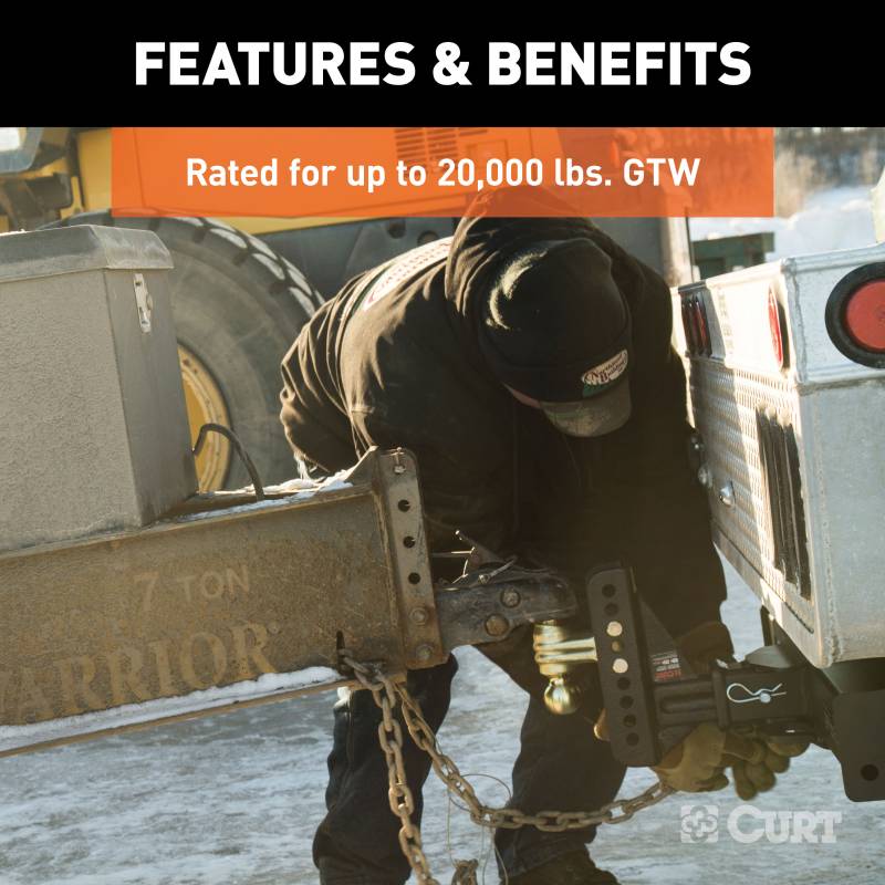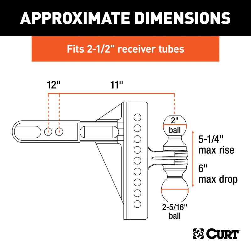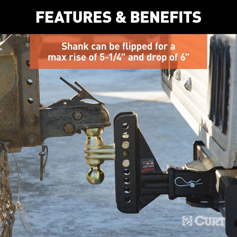 If you own multiple trailers or frequently tow a variety of loads, you know how much time and money are spent tailoring your towing system to each and every individual trailer. There is nothing more inconvenient than switching back and forth between a few different ball mounts and trying to remember which mount fits with which trailer. A CURT adjustable ball mount is your multipurpose towing solution. This CURT adjustable channel-style ball mount has a shank size of 2-1/2" x 2-1/2" and features two different trailer ball sizes to accommodate two different coupler sizes: 2" and 2-5/16". It also features an adjustable shank assembly with multiple mounting holes for varying ball heights. Each trailer ball can be raised to a maximum of 5-1/4" rise or lowered to a maximum of 6" drop, allowing you to make your trailer completely level in any towing situation. The channel-style design and dual-pin mounting system also provide a built-in anti-rattle feature to eliminate obnoxious chucking noises. This CURT adjustable ball mount offers a gross trailer weight capacity of up to 10,000 lbs. for the 2" ball and 20,000 lbs. for the 2-5/16" ball. It allows you to tow a variety of heavyweight trailers, and it features two pin holes in the shank to be mounted at an 11" or 12" length. The adjustable channel-style shank can also be used with the channel-style combination pintle mount or ball mount platform attachment to give you the option of installing your own trailer ball size. All CURT channel-style adjustable ball mounts are made with sturdy steel construction and come with our black carbide powder coat finish for long-lasting rust, scratch and UV resistance.