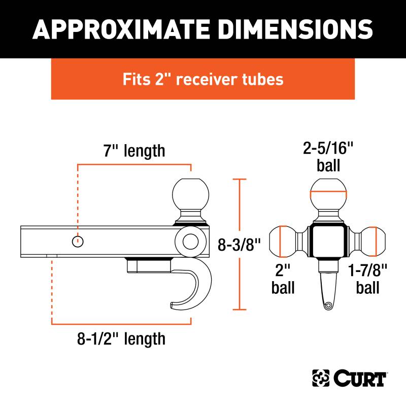 Hauling some yard waste to the city dump? Taking the family camping for the weekend? Pulling some heavy-duty equipment around the farm? If you own more than one trailer, you know what a hassle it can be switching back and forth between ball mounts and keeping track of which ball mount fits which coupler. CURT has made things simple with the multi-ball mount with tow hook. This all-in-one ball mount behemoth features three trailer balls with three different ball diameters and a tow hook for recovery towing. It allows you to easily accommodate multiple trailers and coupler sizes and fits any trailer hitch with a 2" x 2" receiver tube opening. For whatever trailer you are towing on any given day, the multi-ball mount makes it easy to hitch up and go. With three trailer balls on one shank, simply rotate the ball mount to the correct size ball, insert a hitch pin and you are ready to couple your trailer. There is no need to switch and store multiple ball mounts or to mount and torque different size trailer balls. The tow hook and all three trailer balls on the multi-ball mount are welded onto a solid steel shank, giving them a strong foundation and eliminating the possibility of coming loose or being stolen. The 1-7/8" trailer ball offers a gross trailer weight capacity of up to 3,500 lbs. and a tongue weight rating of 350 lbs. The 2" ball has a GTW capacity up to 5,000 lbs. and a TW rating of 500 lbs. The 2-5/16" ball can tow up to 10,000 lbs. of GTW and 1,000 lbs. of TW. With the added tow hook, the multi-ball mount is also the perfect accessory for recovering stuck vehicles or straight-line pulling various loads. The tow hook's capacity is limited to the trailer hitch's capacity. The CURT multi-ball mount comes with a durable black powder coat finish on the shank to help it withstand prolonged exposure to the elements, and it features two possible attachment lengths of 7" or 8-1/2".