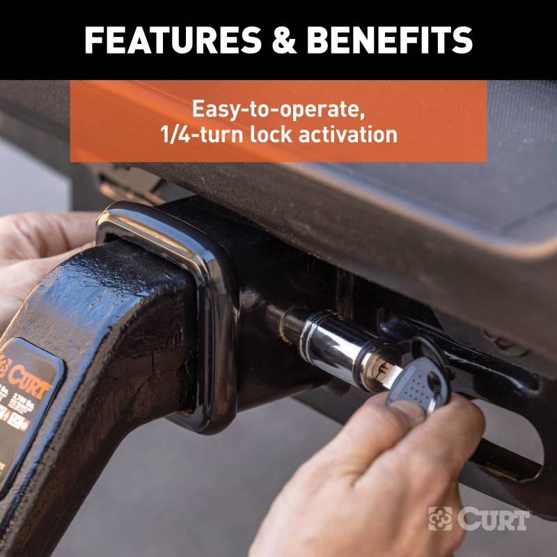 Make your tow vehicle and trailer more secure by keeping them locked up tight with a CURT hitch lock. Like a hitch pin and clip, a hitch lock is designed to insert into the fastener hole in the side of a receiver tube in order to hold a ball mount or hitch-mounted accessory in place. While a CURT hitch pin does offer sufficient strength for keeping your ball mount firmly attached, a CURT hitch lock goes one step further. CURT hitch locks allow you to lock your ball mount into your trailer hitch, deterring theft and preventing anyone from detaching your trailer at the ball mount and towing away your property without your permission. This CURT hitch lock features a barbell design and comes with a 5/8" pin diameter to fit a 2" or 2-1/2" receiver tube size. CURT barbell hitch locks are comprised of a pin with two end caps and a round locking mechanism. They are key-operated and activate with a simple 1/4-turn. They also come with watertight dust caps to keep out the elements and prevent corrosion. For the ultimate in towing security, a hitch lock and coupler lock used together will provide security at both the vehicle-side and trailer-side of your towing setup. For your boat, ATV or camper, keep your toys more secure with CURT hitch locks.
