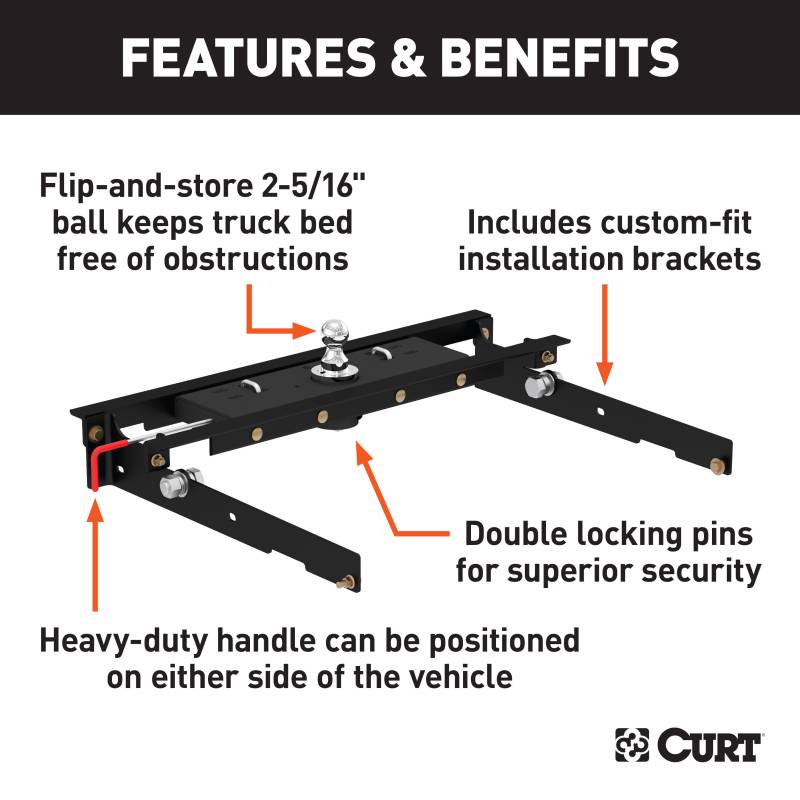 A CURT gooseneck hitch is more than a necessary tool for towing; it is an integrated extension of your truck that allows you turn your 4x4 into the workhorse it was designed to be. That is why CURT offers gooseneck hitch kits that include both the hitch and the installation brackets, making it simpler and easier to get your truck towing-ready. This kit includes the CURT Double Lock gooseneck hitch and installation brackets to match. The under-bed Double Lock gooseneck hitch gets its name from the two locking pins that engage the trailer ball and hold it in place, giving you twice the security when towing especially heavy trailers. The Double Lock mounts underneath your truck bed, using the included brackets, and provides a removable 2-5/16" gooseneck trailer ball with a gross trailer weight capacity up to 30,000 lbs. and a tongue weight capacity of 7,500 lbs. Using the heavy-duty operating handle, the trailer ball can be unlocked and flipped over whenever necessary to allow full use of the truck bed. The Double Lock comes with solid safety chain hookups, an attractive chrome trim ring, a durable A-coat finish and a limited lifetime warranty. This particular Double Lock gooseneck hitch kit is design to be a custom fit for certain years of the Ford F150, Ford F250 with old body style or Ford F350 (for a complete listing of vehicle and installation bracket compatibility, see application info).