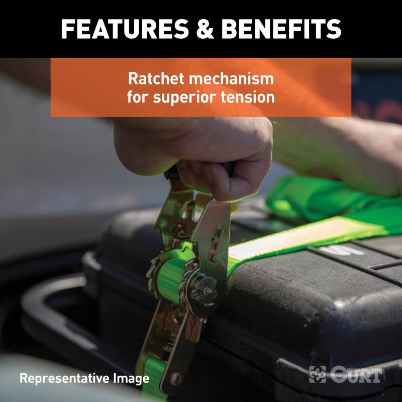 Wrapping rope around your trailer and hoping for the best is not the ideal way to secure cargo. Even using a net of bungee cords can create an unsafe scenario if just one of those bungees pops loose. Using the right method to secure your cargo is an important aspect of towing that is too often overlooked. When you need cargo security that can handle the long haul, you need CURT cargo straps. We offer two different types of cargo straps in a variety of colors, lengths and with various hook types to give you a complete towing solution. These CURT ratchet tie down straps are designed to accommodate larger, heavier loads. They are made from a high-strength, woven nylon material and come with a ratcheting buckle that allows for superior tension on the load. They feature a break strength of 1,500 lbs. and a work load limit of 500 lbs. These red cargo straps come equipped with rubber-coated S-hooks for a secure hold and strong resistance to corrosion and wear. They measure a total length of 10' and have a strap width of 1". Two ratchet straps are included in this package. Packing up your vehicle for a long trip does not have to turn into a game of Tetris. With CURT cargo management, it is easy to give yourself adequate storage room even in the smallest cars. For that weekend getaway or trip cross-country, you can Bring It all with CURT.