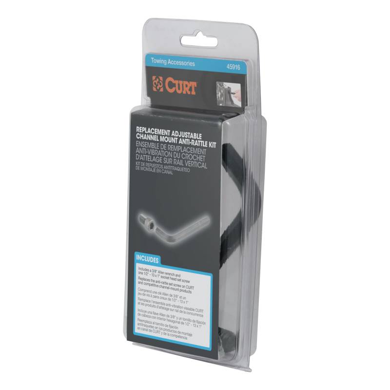 This replacement anti-rattle kit is designed to fit CURT adjustable channel mounts #45902 and #45908. It threads into the back of the channel mount and tightens to reduce vibrations.