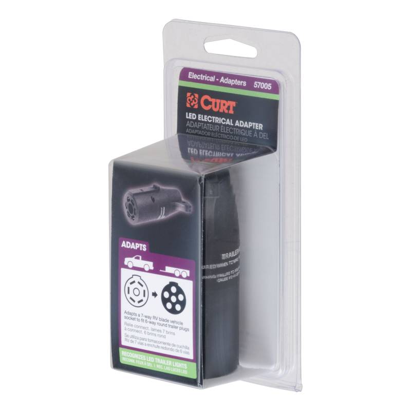 There are several different types of connectors used to supply power from a tow vehicle's electrical system to a trailer's wiring system. Some trailers only need the bare essentials -- running lights, brake lights and turn signals -- while others require a connection for reverse lights, electric brakes and auxiliary power. With connectors ranging from simple to complex, it may be the case that the connection between your vehicle and your trailer is not a perfect match. For example, your truck may be equipped with a 6-way round socket, but your trailer may have a 4-way flat plug. For this very common problem, CURT offers a quick and simple solution in the form of an electrical adapter. An adapter is an electrical device that allows a connection to be made between a mismatched trailer plug and vehicle socket. It easily plugs in your vehicle's electrical socket and usually requires no additional wiring. CURT offers an array of adapters to accommodate most types of plugs and sockets, including 4-way flat, 4-way round, 5-way flat, 6-way round, 7-way RV blades and more. This electrical adapter is designed to adapt a 7-way RV blade vehicle socket to fit a 6-way round plug on a trailer with LED lights. It features built-in resistors for vehicles with computers that don't recognize LED lights and enables them to be compatible with trailers that have them. It also has a simple plug-and-play design and requires no splicing. All CURT wiring and electrical products come with a one-year limited warranty to give you the assurance you need to tow with confidence.
