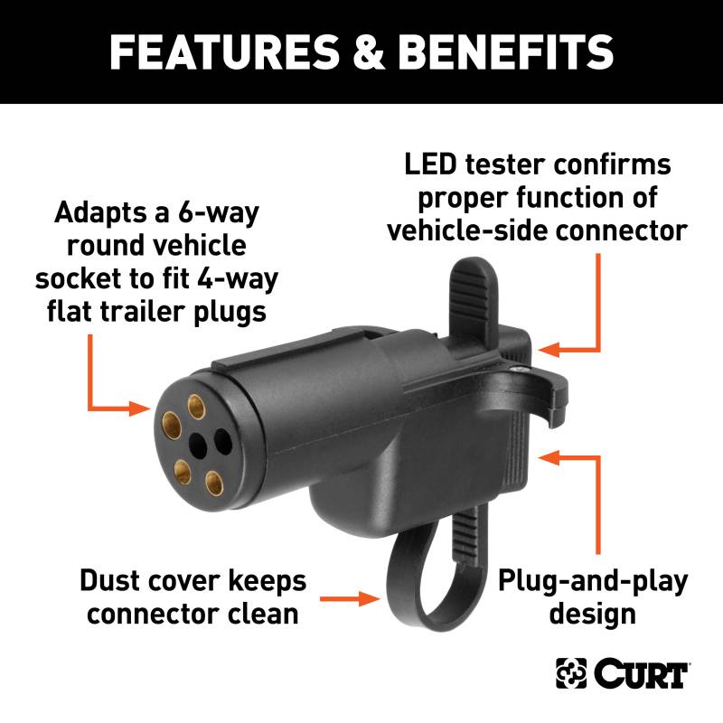 There are several different types of connectors used to supply power from a tow vehicle's electrical system to a trailer's wiring system. Some trailers only need the bare essentials -- running lights, brake lights and turn signals -- while others require a connection for reverse lights, electric brakes and auxiliary power. With connectors ranging from simple to complex, it may be the case that the connection between your vehicle and your trailer is not a perfect match. For example, your truck may be equipped with a 6-way round socket, but your trailer may have a 4-way flat plug. For this very common problem, CURT offers a quick and simple solution in the form of an electrical adapter. An adapter is an electrical device that allows a connection to be made between a mismatched trailer plug and vehicle socket. It easily plugs in your vehicle's electrical socket and usually requires no additional wiring. CURT offers an array of adapters to accommodate most types of plugs and sockets, including 4-way flat, 4-way round, 5-way flat, 6-way round, 7-way RV blades and more. This electrical adapter is designed to adapt a 6-way round vehicle socket to fit a 4-way flat trailer plug. It features quality plastic construction, requires no splicing and comes with an LED connector tester dust cover. Not only does this dust cover protect the socket from dirt, water and road grime, but it also allows you to test your vehicle-side wiring connector to ensure your electrical systems are functioning properly. All CURT wiring and electrical products come with a one-year limited warranty to give you the assurance you need to tow with confidence.