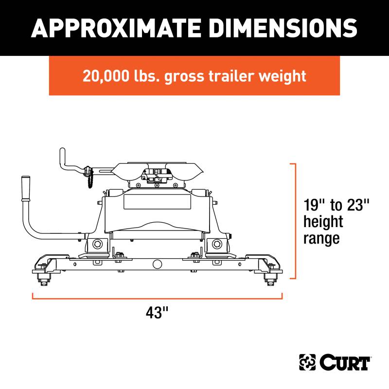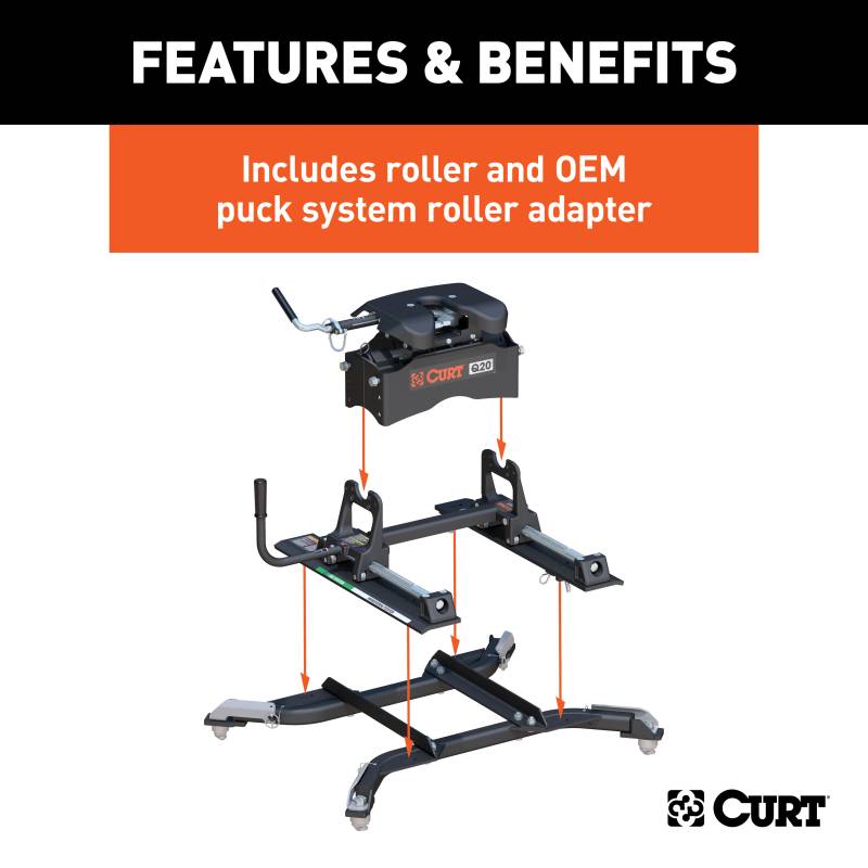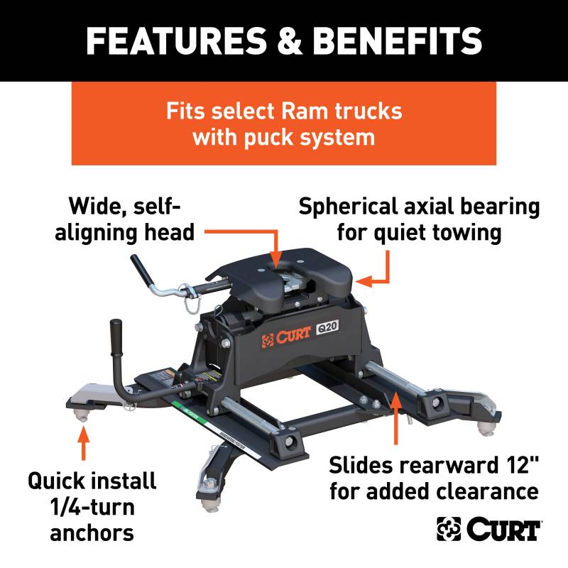 The CURT Q20 is designed to offer the quietest 5th wheel towing possible. It does this using a spherical axial bearing. This unique pivoting mechanism is built into the hitch head and allows it to tilt with the 5th wheel trailer in any direction necessary. With its dual-locking jaws for 360-degree pin contact and three grease fittings for continuous lubrication, the spherical axial bearing provides smooth, safe, quiet towing, even with large 5th wheel trailers. The Q20 also makes the coupling process easier. It features a self-aligning head to help reduce errors when backing up to the kingpin, as well as a three-position coupling indicator. This 20K 5th wheel hitch comes with the CURT R20 slider and the CURT OEM puck system 5th wheel slider adapter. It is designed to be mounted on a Ram short-bed pickup with the truck bed puck system. Using a set of quarter-turn anchors, the adapter quickly and easily drop into the pucks, instantly mounting the Q20 hitch and slider and equipping the truck for 5th wheel towing. Once installed, the R20 slider allows for added clearance when making tight turns with your trailer. CURT 5th wheel sliders are true rolling units, meaning they actually roll on wheels that bear the weight of the trailer rather than simply sliding on hollow rods as seen in competitive models. With a thick operating handle, the roller smoothly rolls the 5th wheel head forward and back, locking securely into each position as desired. CURT sliders also provide up to 12" of displacement as well, unlike the more common 10", to give you a wide range of motion and plenty of space to get your RV or other 5th wheel trailer around any turn. This Q20 hitch with puck system slider is only intended to fit the Ram puck system and cannot be installed without it. Certain turret-style pin boxes, such as Sidewinder, are not compatible with CURT Q-series hitches and should not be used as they may create vehicle / trailer handling hazards.