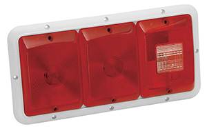 These triple lights are available for either vertical or horizontal mounting. These stylish units with their radius corners have bases available in either black, white, colonial white or chrome plated finish. Clear backup light lenses are surrounded by a Class A red reflex lens. All lenses meet FMVSS/CMVSS 108 requirements. All include J-slot bayonet sockets for dependable flicker-free operation and 16 gauge supply and ground wiring.