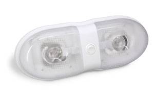 Single or double 12 volt interior light with diffused lens optics. Double light is available with single or dual switch. Two wire construction, supply and ground. Features a polypropylene base. CSA listed/ approved for ceiling mount and specific wall mounts. Contact your Cequent Representative for the specific wall mount applications.