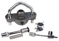 Kit Contains, 1-TS32 1/2" or 5/8" Sleeved Receiver Lock, 1-TC123 Universal Coupler Lock fits from 7/8" to 3-1/2" Span Coupler Latches, and 1-UMAX50 Universal Unattended Coupler Lock. All Keyed Alike. Comes with 6 Keys.